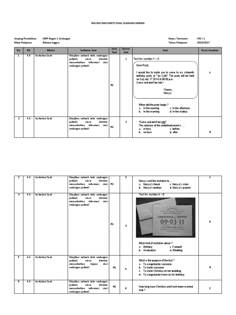 Dan silahkan anda copy dan share kepada orang lain. Daripada ga ada kerjaan , lebih baik ngetik walaupun ngga jelas. Sebelum mencoba latihan ini, alangkah baiknya kalian membaca buku lks dan buku paket kelas viii. Soal kelas 8 matematika, faktorisasi aljabar. Jenis lensa untuk membantu penglihatan edo adalah. Soal pjok kelas 8 semester genap. Atau mungkin diundang oleh teman kalian untuk datang ke rumahnya. Soal kels 8 matematika, persamaan linier. Kumpulan contoh soal teks invitation bahasa inggris beserta jawabannya. Soal pas pkn smp mts kelas 8 semester 1 kunci jawaban. Untuk mengerjakan soal silahkan tekan tombol lanjut yang ada di bagian bawah halaman postingan ini 3. Kalian pasti pernah mengalami salah satu situasi yang disebutkan tadi, karena manusia adalah makhluk sosial. Revealing the meaning of the speech act is very simple short functional accurately, fluently form of the verb in the sentence relating to the invitation to special party.
